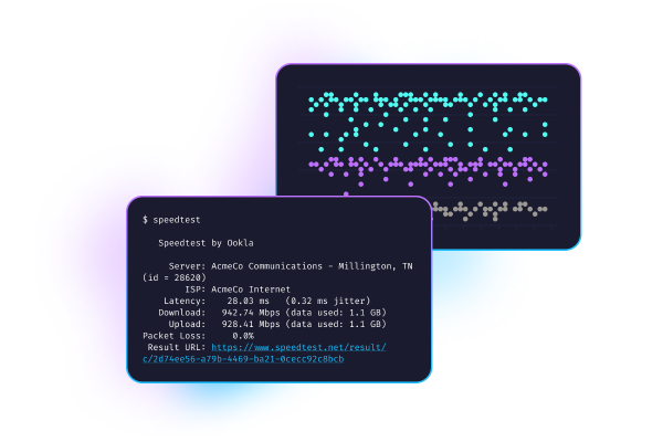 Speedtest CLI używa zaufanej technologii i globalnej sieci serwerów Speedtest w połączeniu z wierszem poleceń. Aplikacja zaprojektowana zarówno dla programistów, administratorów system, jak i entuzjastów komputerów, Speedtest CLI jest pierwszą oficjalną Linux Speedtest aplikacją wspieraną przez Ookla®.
